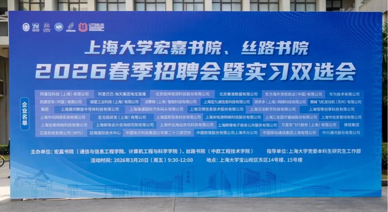 3月20日上午,上海大学宏嘉书院、丝路书院联合举办的“2026年春季招聘会暨实习双选会”在宝山校区东区计算机学院大楼与通信学院大楼顺利举行,本次活动旨在为2026届毕业生搭建高质量就业平台,同时助力2027届学生提前开启职业生涯探索。