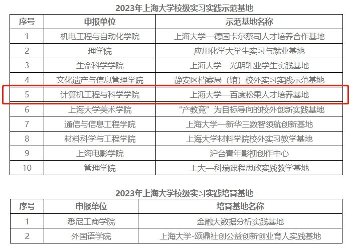 8月28日,2023年上海大学校级实习实践示范基地和培育基地名单正式公布,10个基地为示范基地,2个基地为培育基地。计算机工程与科学学院沈俊、李晓强、方昱春三位教师主持的“上海大学—百度松果人才培养基地”被确立为2023年上海大学校级实习实践示范基地。