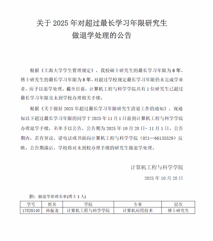 关于2025年对超过最长学习年限研究生做退学处理的公告